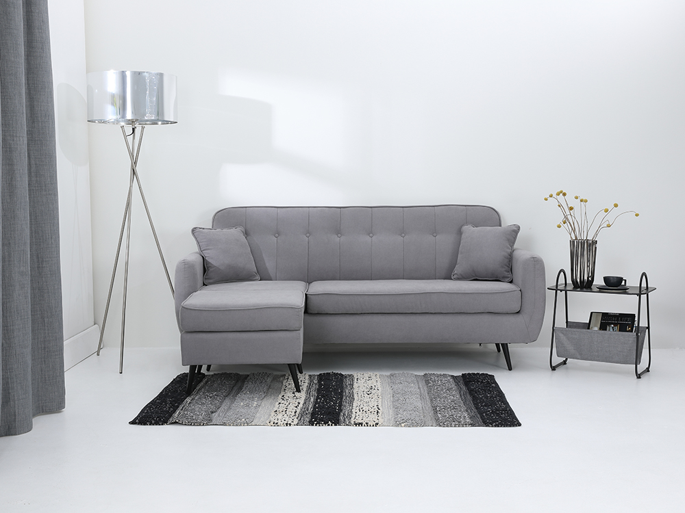 Key Feature :- DAPHNE Fabric L-shape - Made of high quality imported cotton fabric. - Made of solid wood frame for a durable long life use. - High resilient Polyurethane foam for great seating comfort. - Black steel legs. - 2 cushion included, size 40 x 40 cm. Size: W189x D129 x H84 cm.