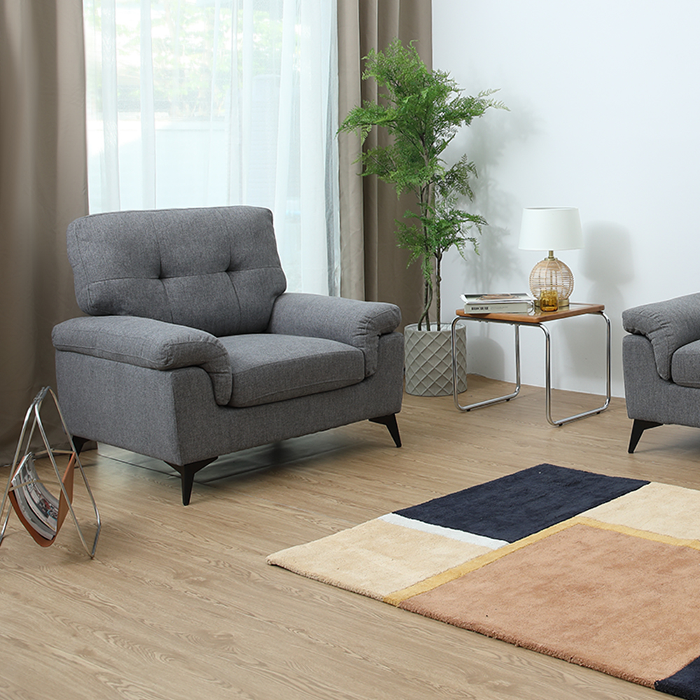 Key Feature :- Lamona 1 seat fabric sofa, modern classic style, size 106cm. - Solid wood frame for strength and durability for a long life. - Padded with good sponge Highly flexible, comfortable to sit. - Covered with polyester fabric, soft to the touch. - Black painted steel legs - Sofa size: W106 x D86 x H92 cm.